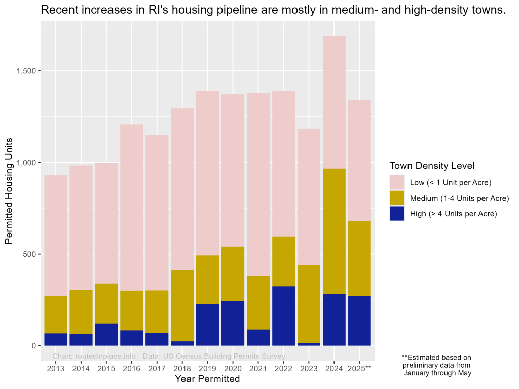 As recognized by our most recent statewide land use plan, Land Use 2025, Rhode Island’s unique identity as a state comes in part from our compact & clustered pattern of historic towns and villages, an identity which is actively being eroded by the sprawling low-density development that took over RI and many other communities in the late 20th century. However, early housing construction indicators from 2024 and early 2025 hint that RI may be starting to turn away from sprawl and back toward a more compact development pattern.