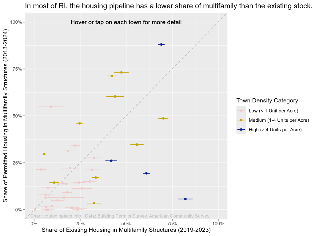 However, many towns in RI increased their multifamily shares of housing, ranging from high-density Providence to low-density Exeter. Interestingly, six out of ten of RI’s medium-density towns in RI added multifamily units proportionately more than their existing housing, with multifamily units representing just under half of existing homes in both East Providence and West Warwick but making up more than 70% of permitted units in those towns from 2013 through 2024.