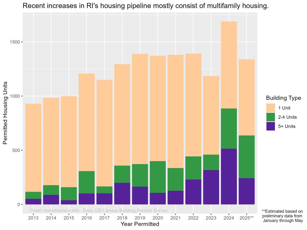 Most of the data for this analysis come from the US Census’ Building Permit Survey (BPS), which publishes monthly counts of housing units by structure type that receive permits to begin construction, as reported by municipalities. However, this survey only captures homes that are added through new construction, not from conversions or renovations. Hence, housing permitting numbers based on BPS data are lower than what is reported by the RI Department of Housing using their own surveys and additional data sources. The main advantages of BPS data are that they offer better comparability between communities and over time. The survey has existed for decades, but in this post I focus on trends from 2013 (the earliest year of BPS data in its “Detailed Revised Monthly” series) through May 2025.